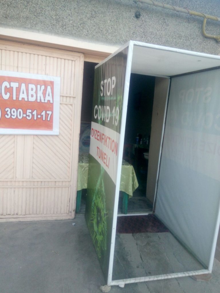 そういった中で、大小の食事処(レストランやチャイハナ、カフェ等)はそれぞれ大急ぎの対策と、経営の巻き返しを図っている。みんな「いつまでこの自由が続くのか」と内心ドキドキしているからかな。再びロックダウンが来る前に急げ急げという訳だ。その一つ、小さな小さな食事処に登場した消毒トンネルを紹介したい。